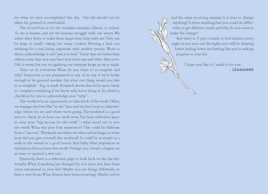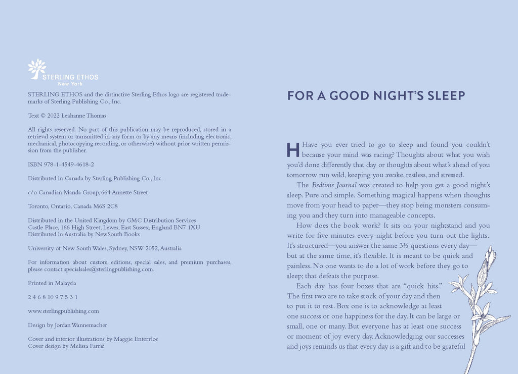 A charming, easy-to-use journal to help you clear your mind before you go to bed—for a good night's sleep. Do you often find yourself tossing and turning at bedtime, worrying about stuff that happened during the day or things you need to do? This simple, beautifully illustrated journal helps clear out the stressful thoughts so you can fall asleep, with three simple questions in squares—What was one success you had today? What's one thing you would've liked to have done differently? What's one goal you'd like to achieve tomorrow?—and one square of checkboxes with the whys for your goal. Weekends are covered in reflective pages that allow you to look back and ahead, and inspiring quotes from famous writers, thinkers, leaders, and entertainers are scattered throughout. Flexibound book; 4.625 x 6 3/4 inches; 320 pages.