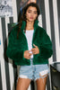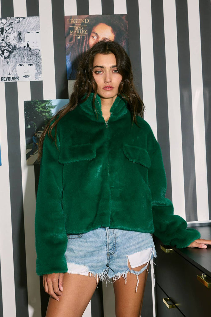 Zip-Up Faux Fur Crop Jacket - Stand collar - Zipper closure - Long sleeves - Front Patch Pocket