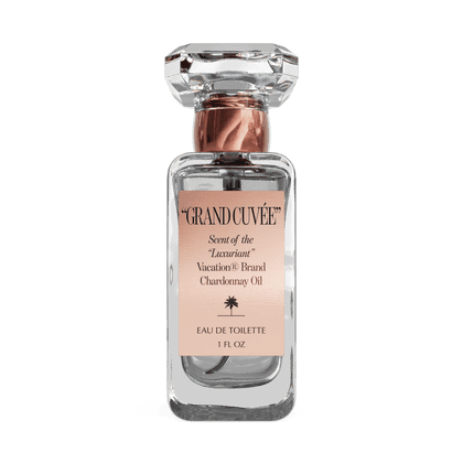 “GRAND CUVÉE” by Vacation® is the signature scent of the “Luxuriant” Vacation Brand Chardonnay Oil. Serving as a ceremonious toast to “the good life,” it transports the wearer atop a teakwood yacht at sunset with notes of Argan, Amber, Vanilla, Peach Eau de Vie, & an oceanic hint of Sunwashed Sails.