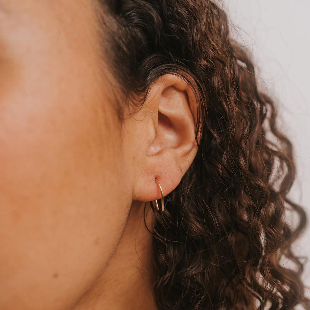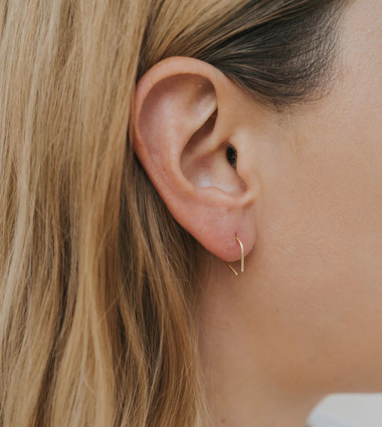This slim horseshoe hooks through and hugs tight to balance off as a single or multiple earring look. No backing needed on this one!